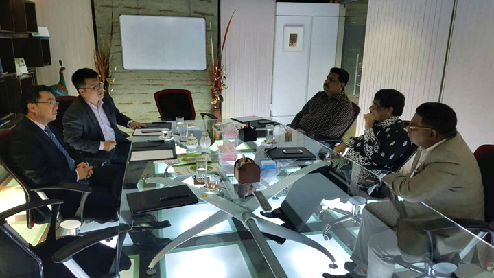 19日的開幕式上,中國駐孟加拉國參贊李光軍及孟加拉中國商會林維強會長等致辭并蒞臨三新集團展廳,與洪長禧總經理親切會談。