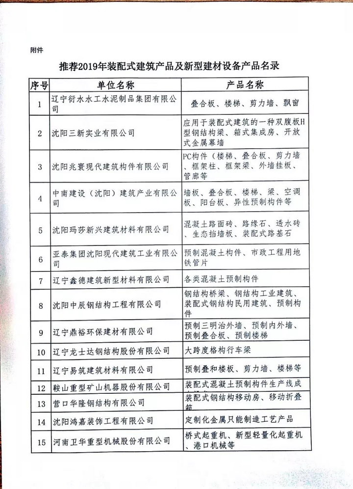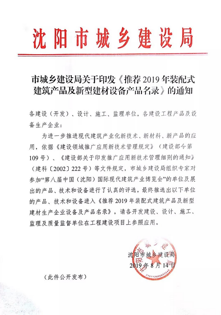 2019年8月14日,沈陽市城鄉(xiāng)建設局發(fā)布《推薦2019年裝配式建筑產(chǎn)品及新型建材設備產(chǎn)品名錄》,我公司雙腹扳H型鋼結構梁、箱式集成房、開放式金屬幕墻等產(chǎn)品成功入選。