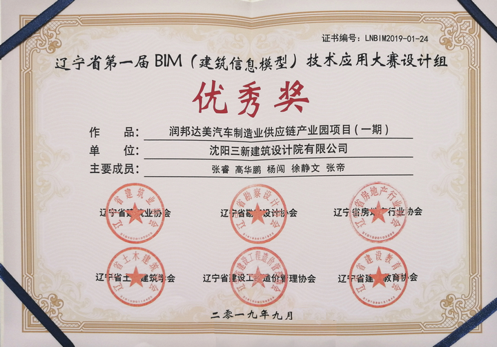 2019年10月18日,“遼寧省第一屆BIM(建筑信息模型)技術(shù)應(yīng)用大賽”召開了頒獎大會,頒發(fā)獎牌及榮譽(yù)證書。我公司由張睿、高華鵬、楊闖、徐敬文、張帝組成的BIM團(tuán)隊提交的參賽項目《潤邦達(dá)美汽車制造業(yè)供應(yīng)鏈產(chǎn)業(yè)園項目(一期)》斬獲遼大賽優(yōu)秀獎。