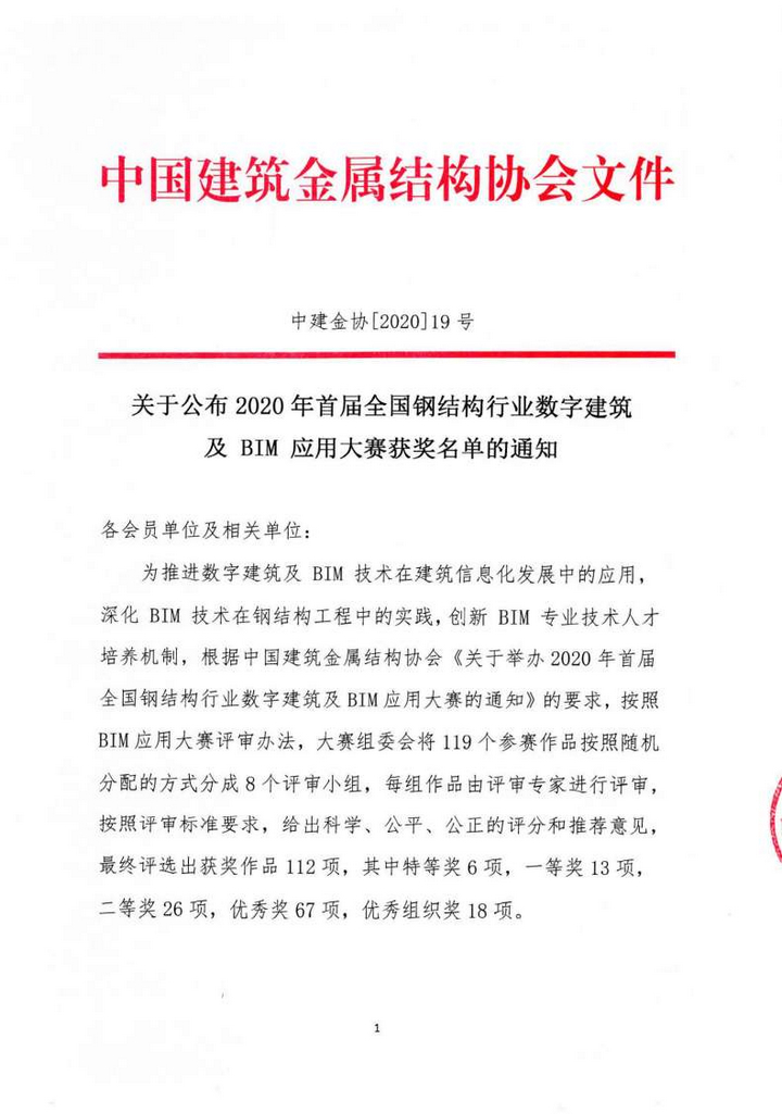 由中國建筑金屬結構協(xié)會主辦的《2020年首屆全國鋼結構行業(yè)數字建筑及BIM應用大賽》評審結果于2020年9月15日揭曉。我公司由張睿、高華鵬、楊闖、徐敬文、張帝組成的BIM團隊提交的參賽項目《潤邦達美汽車制造業(yè)供應鏈產業(yè)園項目(一期)》斬獲大賽優(yōu)秀獎。
