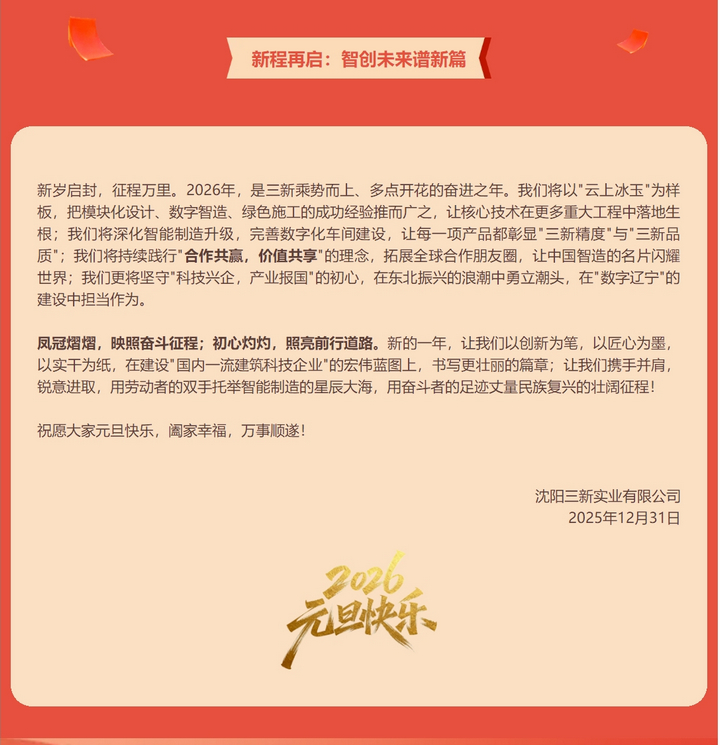 鳳冠彰碩果 新質(zhì)啟華章——沈陽三新實業(yè)2026年元旦獻詞